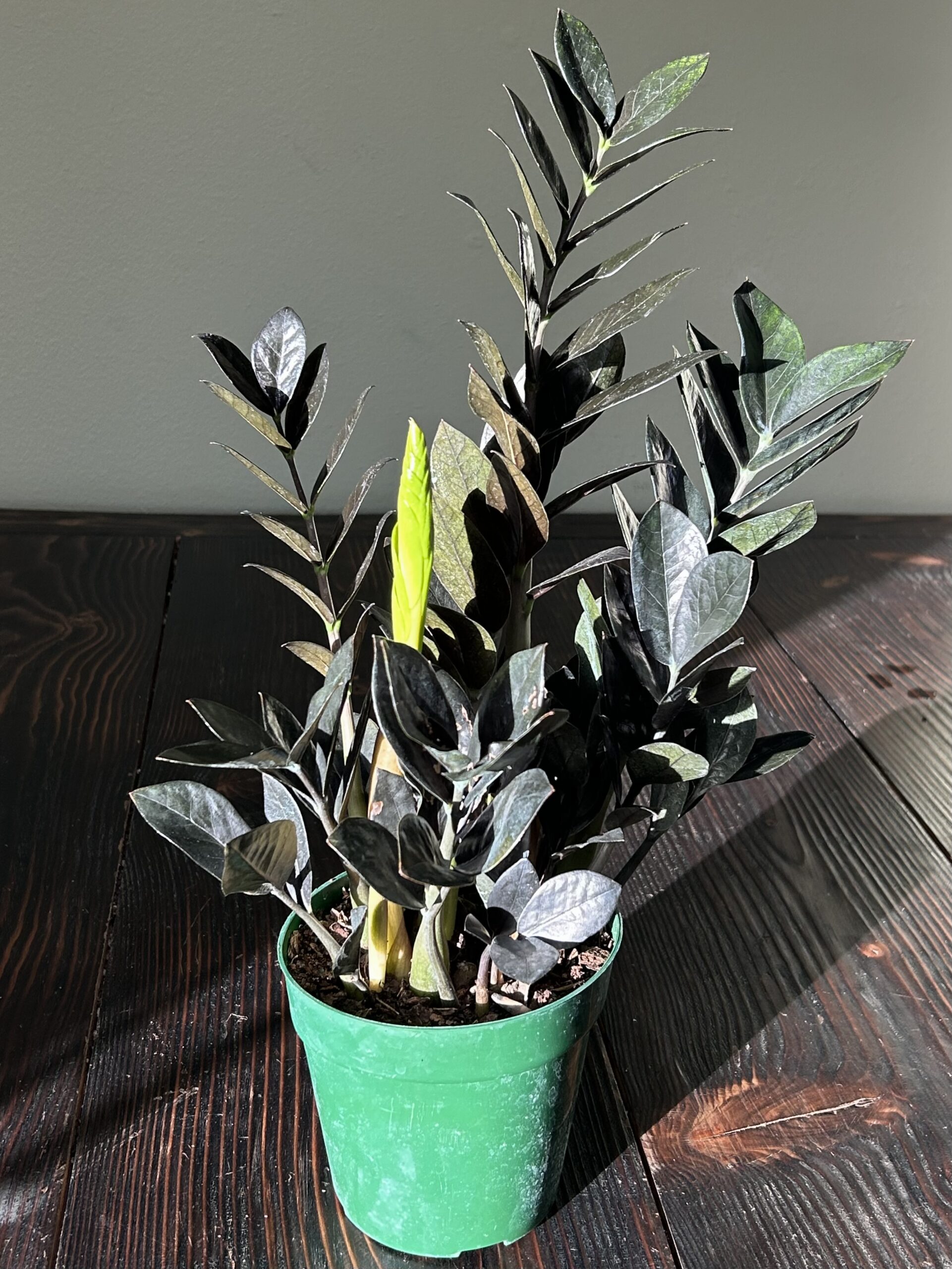 The ZZ Raven is a striking, low-maintenance houseplant prized for its dramatic foliage that emerges bright green and deepens to an inky, near-black as it matures. Just as tough as the classic ZZ, it thrives in low to bright indirect light and requires minimal watering, making it ideal for busy plant parents and modern spaces. With its bold color and sculptural form, the ZZ Raven adds instant sophistication to any room.
